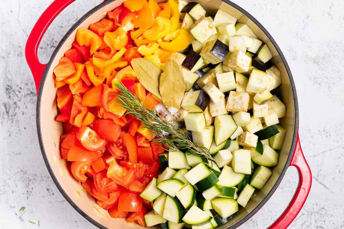 You will need a large Dutch oven or soup pot to make this recipe. When chopped and raw, the veggies take up a lot of space, so I recommend using a minimum of a 5-quart or 5-litre pot. 6 is a bit more comfortable. By the time they have cooked, their volume reduces by about half, so don't worry about ending up with mountains of ratatouille.