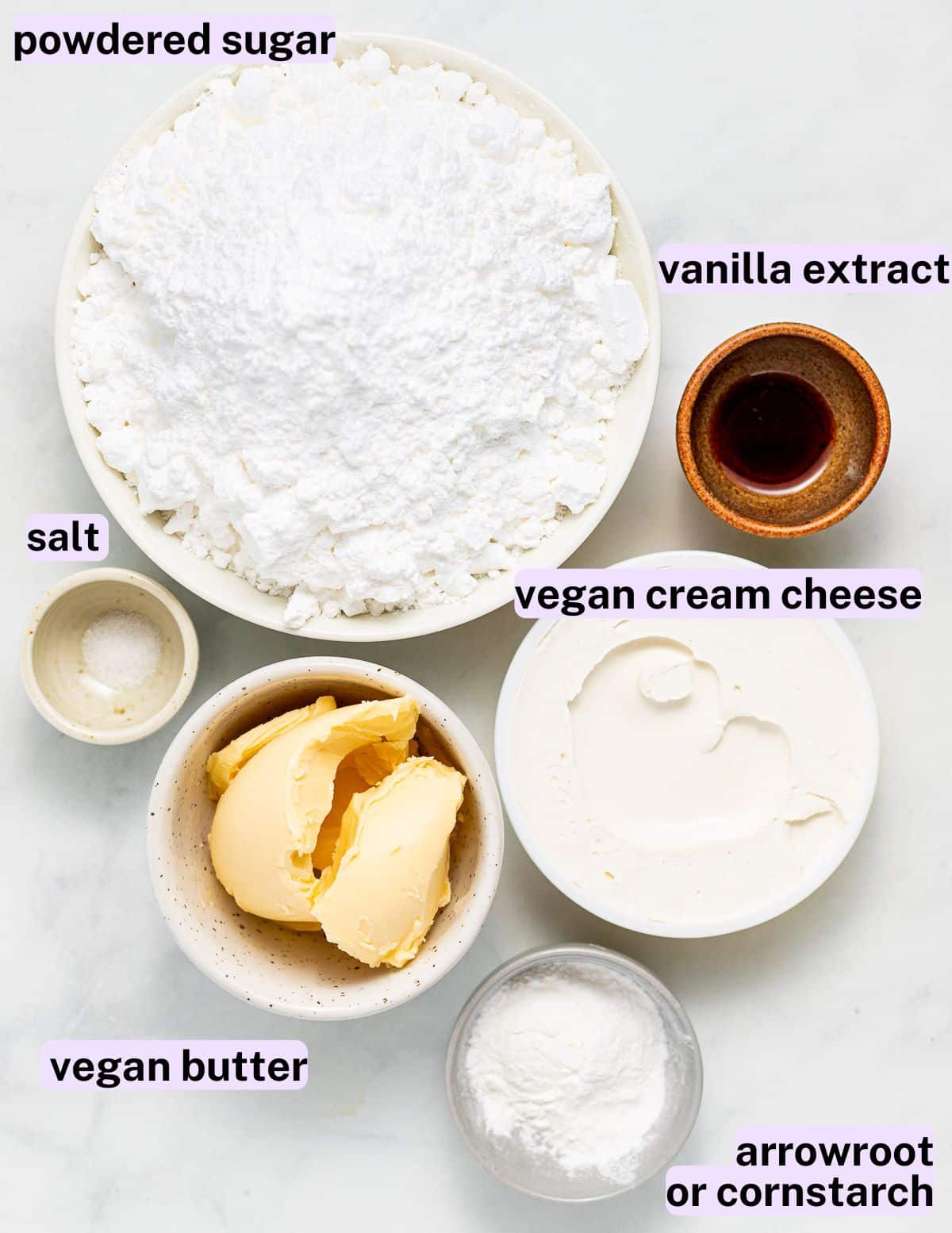 - Arrowroot or cornstarch - Unlike non-vegan cream cheese and butter, vegan versions contain a lot of water. Arrowroot or cornstarch helps to absorb some of the moisture and firm the frosting, giving it a texture more like frosting made with non-vegan cream cheese and butter.
