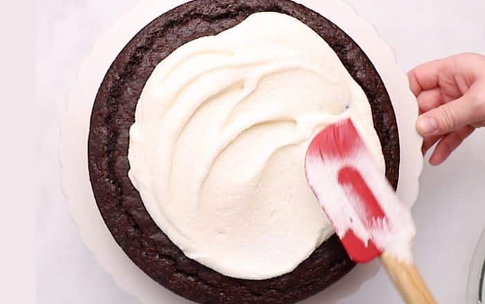 - Swoosh the cream cheese frosting all over the top with a spatula.