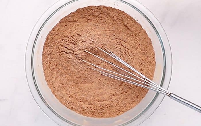 - To a mixing bowl add the flour, sift in the cocoa, then add the baking powder, baking soda, salt and sugar. Whisk them together to combine.