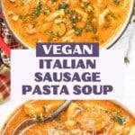 One-pot Vegan Italian Sausage Pasta Soup! It's hearty, rustic, and comforting, with a creamy tomato-y soup base, lots of herbs and garlic, vegan sausage chunks, and pasta. Ultimate vegan comfort food!