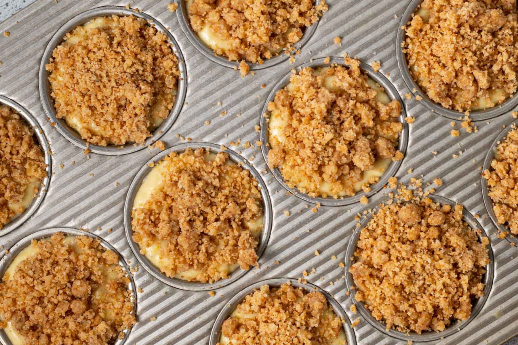 - Remove the streusel from the fridge and sprinkle a really generous amount on the top of each muffin. Press it in just a little with your fingers then get the muffins straight in the oven. Don't leave them hanging around.