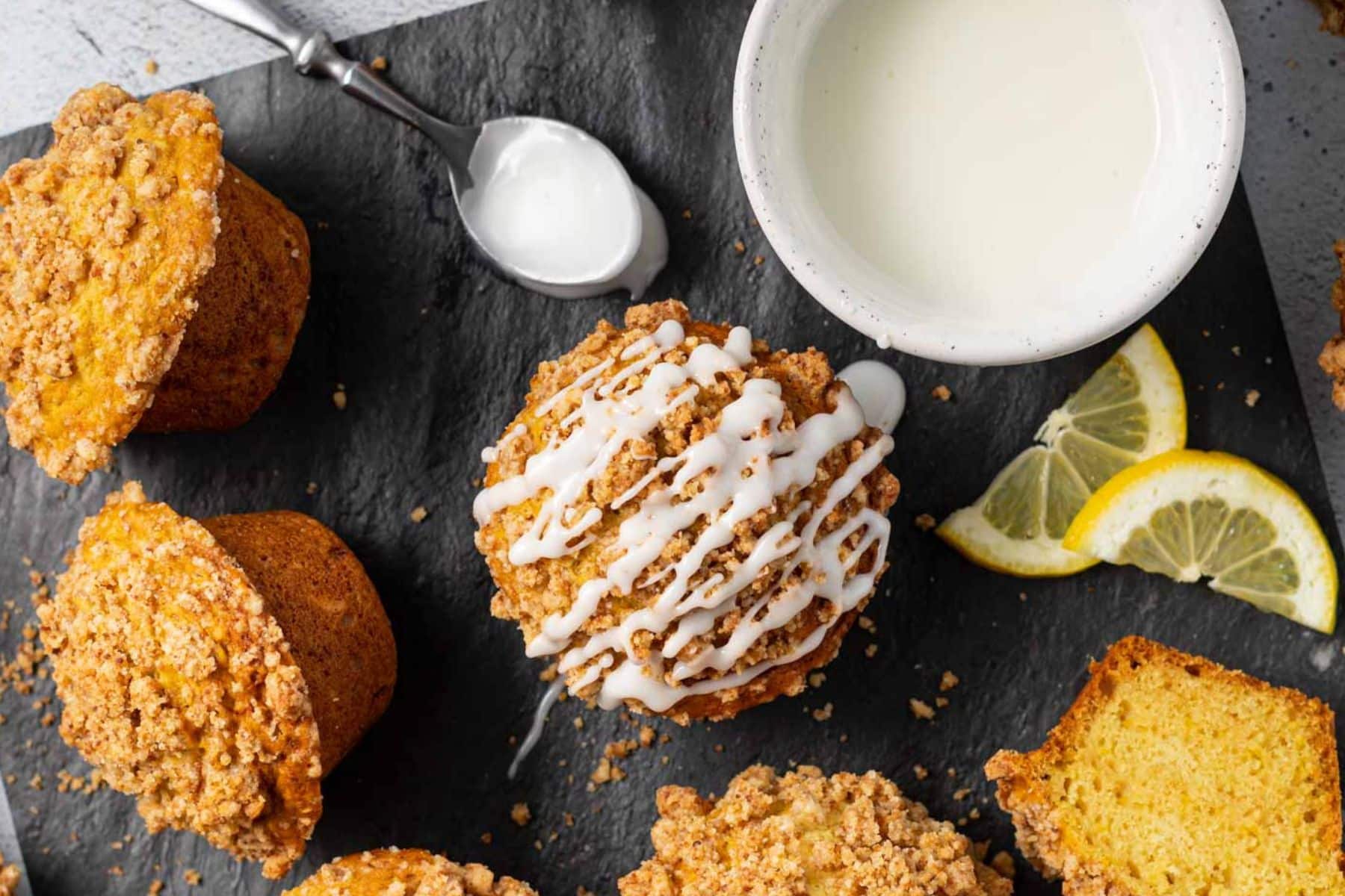 - Using a teaspoon, drizzle the glaze all over the top of the muffins allowing some to drip down the sides. The more rustic the better!