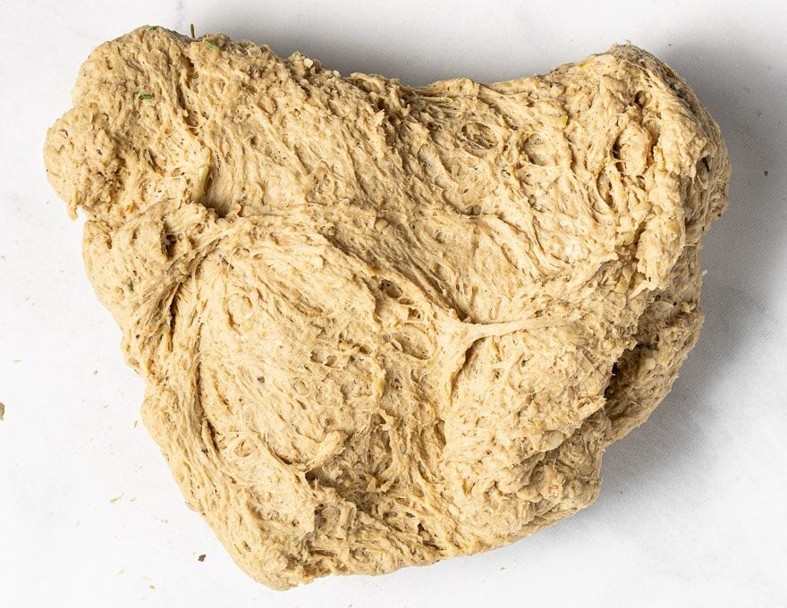 Knead until it looks fibrous. Don't skip this step. Some seitan recipes come out tough as old boots if you knead them too much and I don't want you to be scared of that. I promise that as long as you follow my recipe exactly, this one won't. Even if you get carried away and knead it way more than called for it will still be beautifully tender.